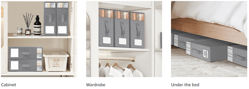 - Етикети и дръжки: Намерете това, от което се нуждаете бързо с нашите етикетирани кутии за съхранение. Дръжките улесняват изтеглянето им от гардероба и достъпа до вашите спално бельо.