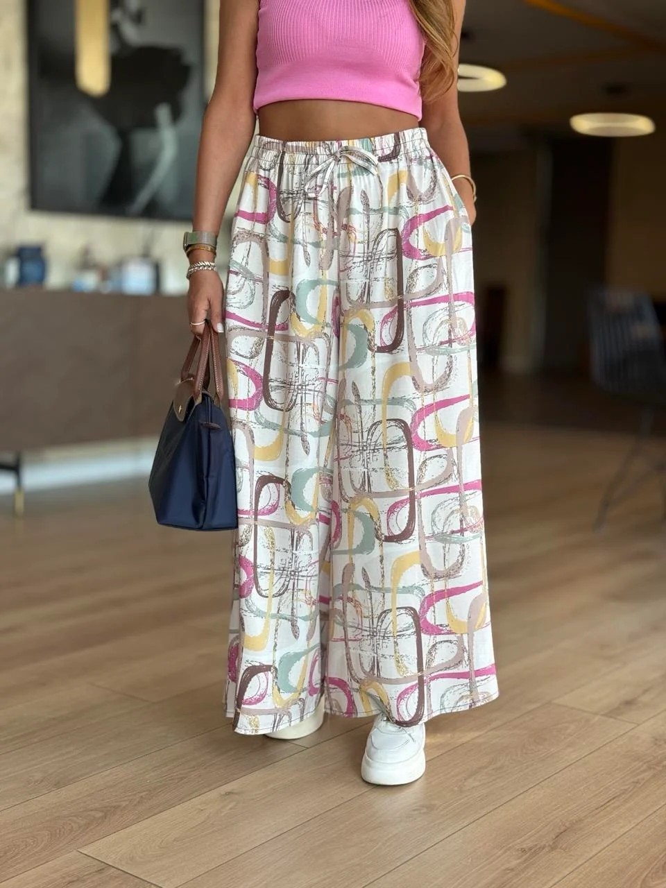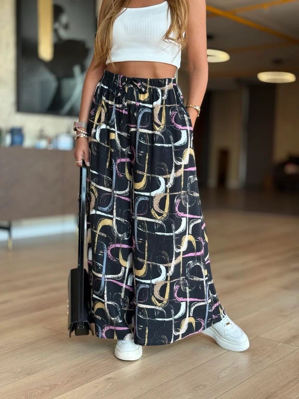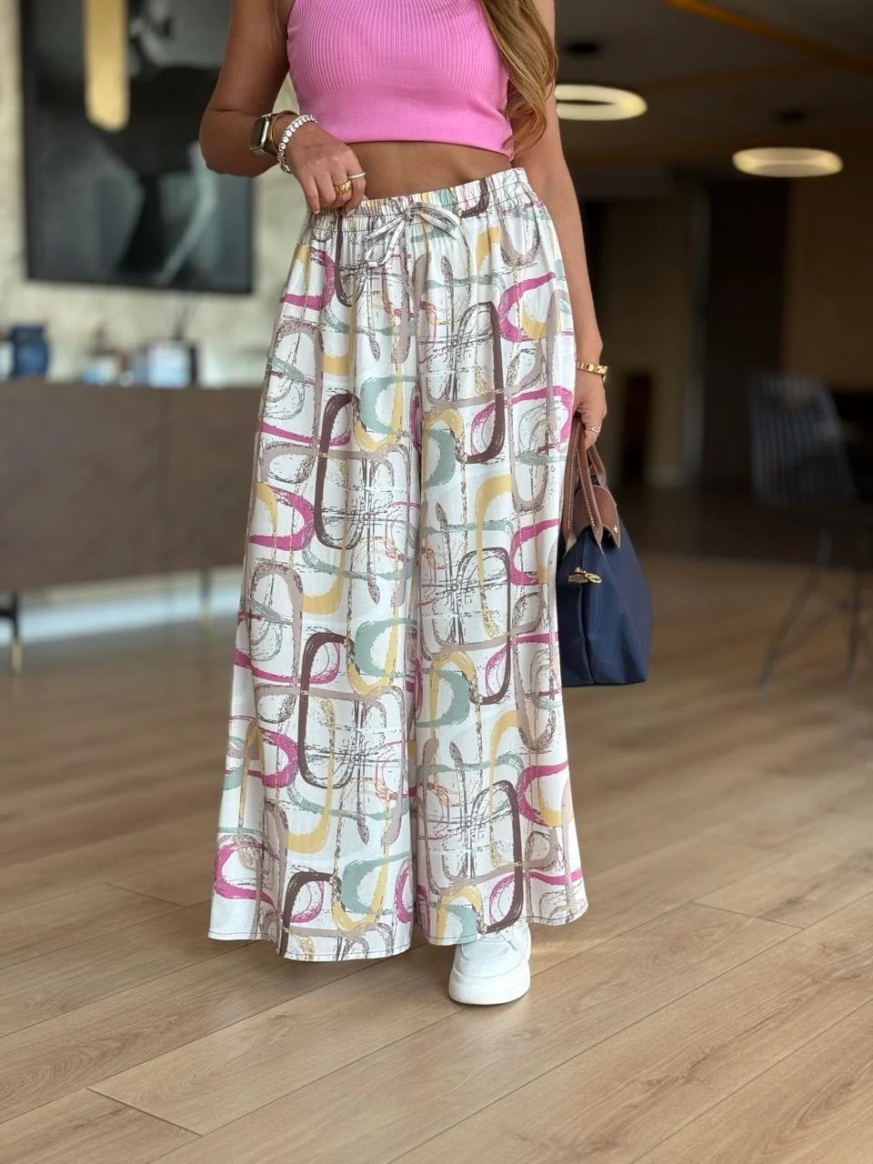 СТИЛНИ И УНИВЕРСАЛНИ ПРИНТОВЕ: Със стилни принтове по цялата повърхност и модни широки крачоли, тези панталони лесно се комбинират с тениски, топове и други облекла за всякакъв повод.