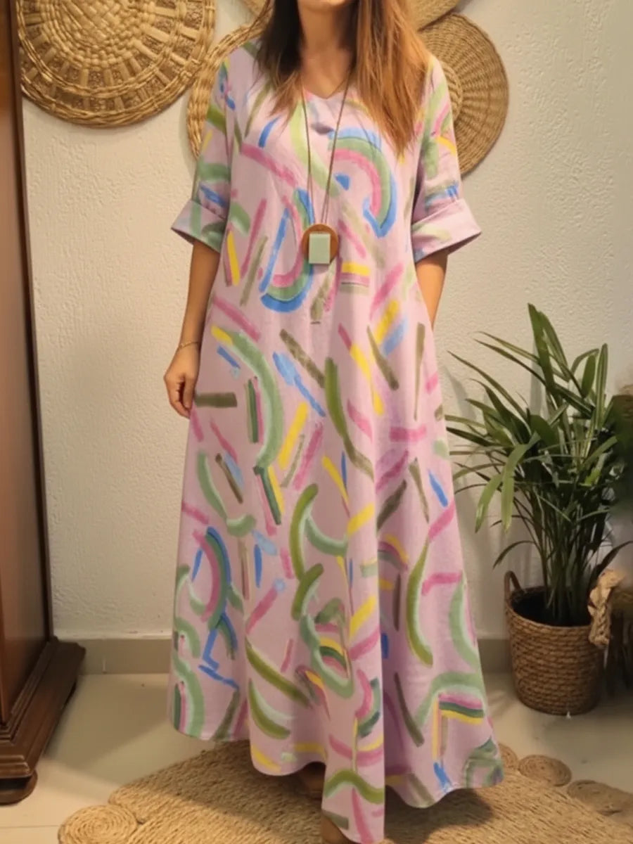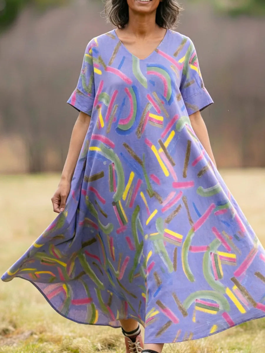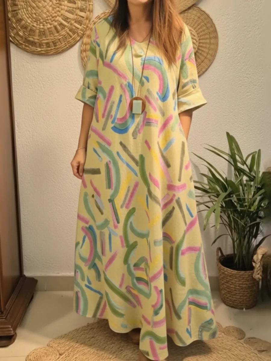 Vestido de lino artístico, colorido y suelto con estampado de pinceladas.