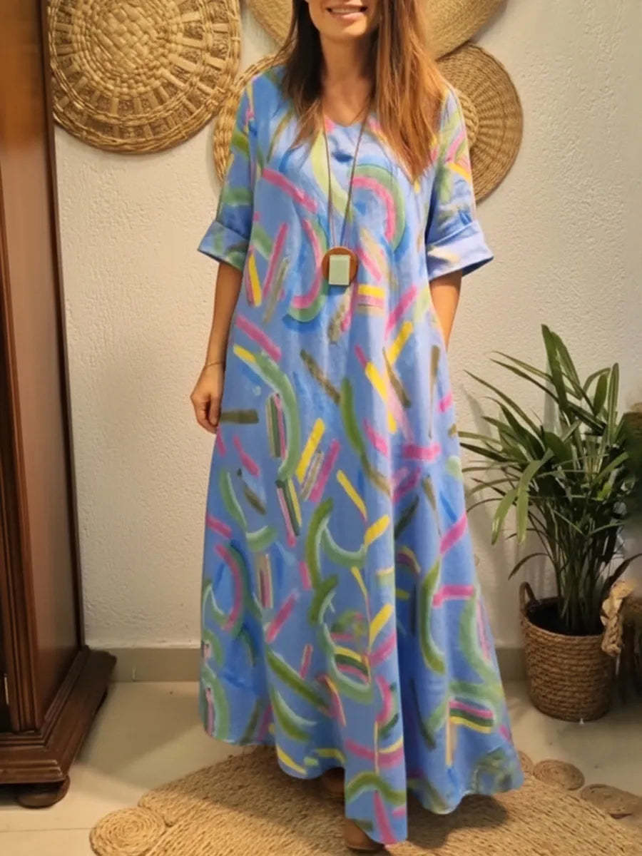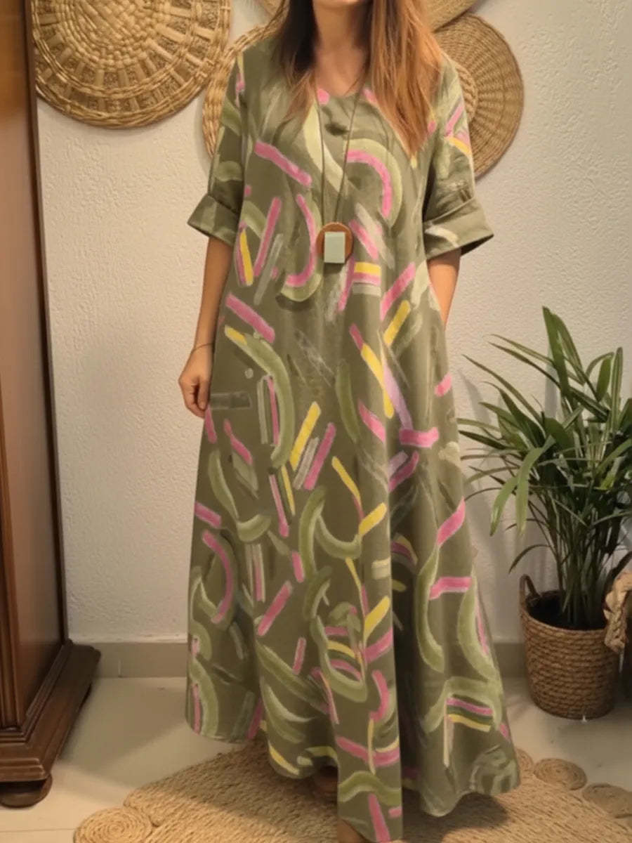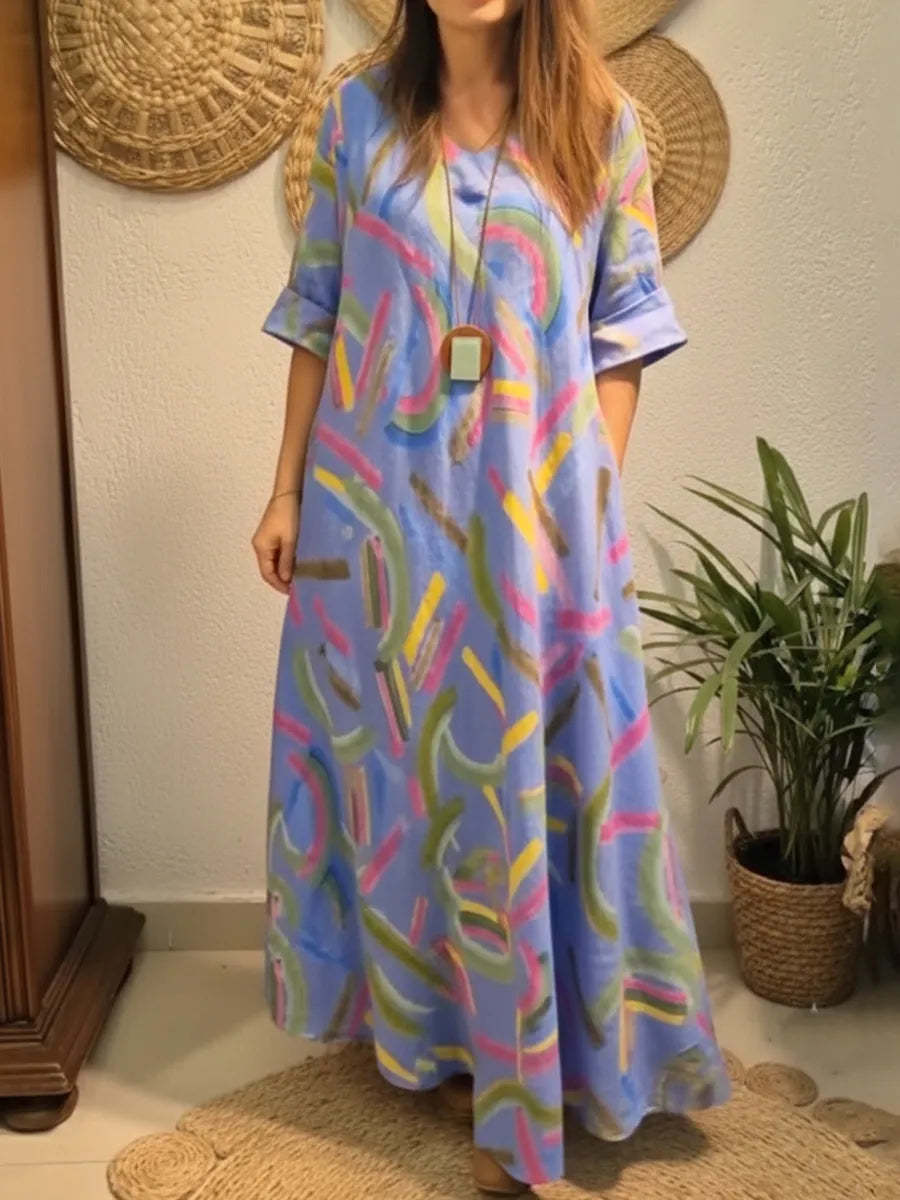Vestido de lino artístico, colorido y suelto con estampado de pinceladas.