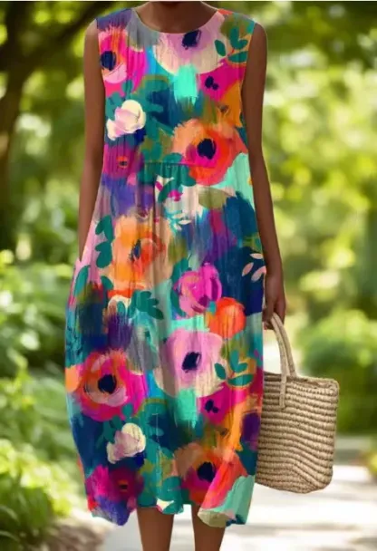 Ženska haljina bez rukava s okruglim izrezom, izrađena od pamuka i lana