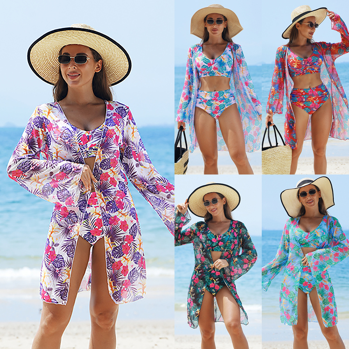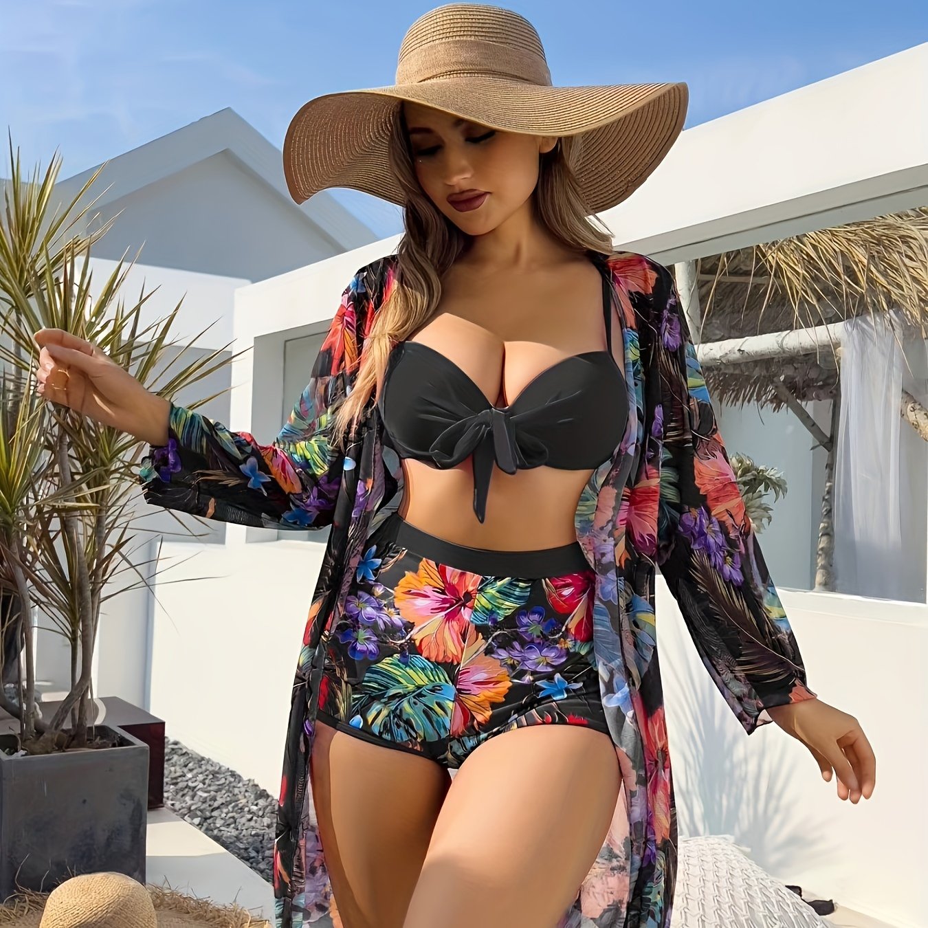 🌊Tropinis 3 dalių bikini rinkinys (su priekyje surišamomis šortais ir ilgomis rankovėmis)