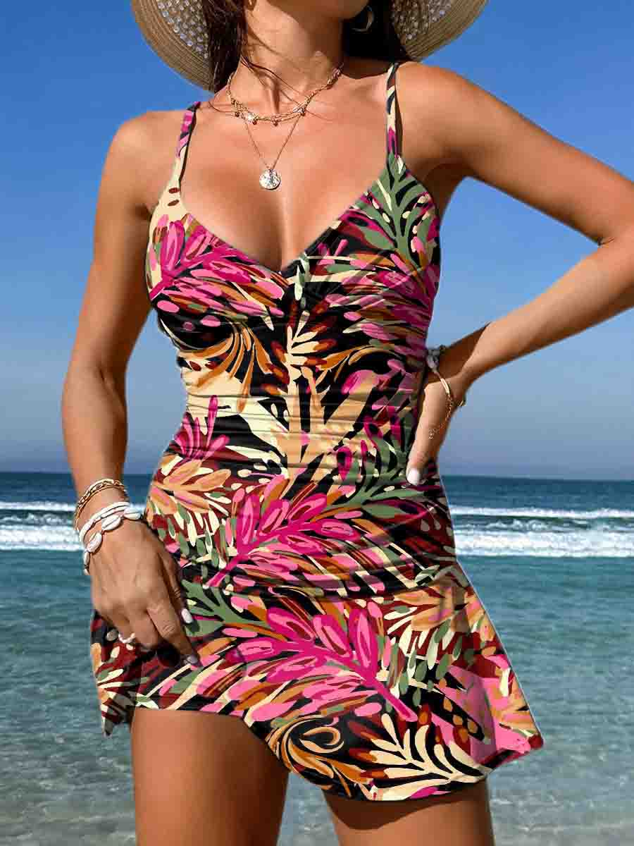 Dekoltas su sėklomis, abstraktus raštas, spauda, bikini ant petnešų, vientisas maudymosi kostiumėlis