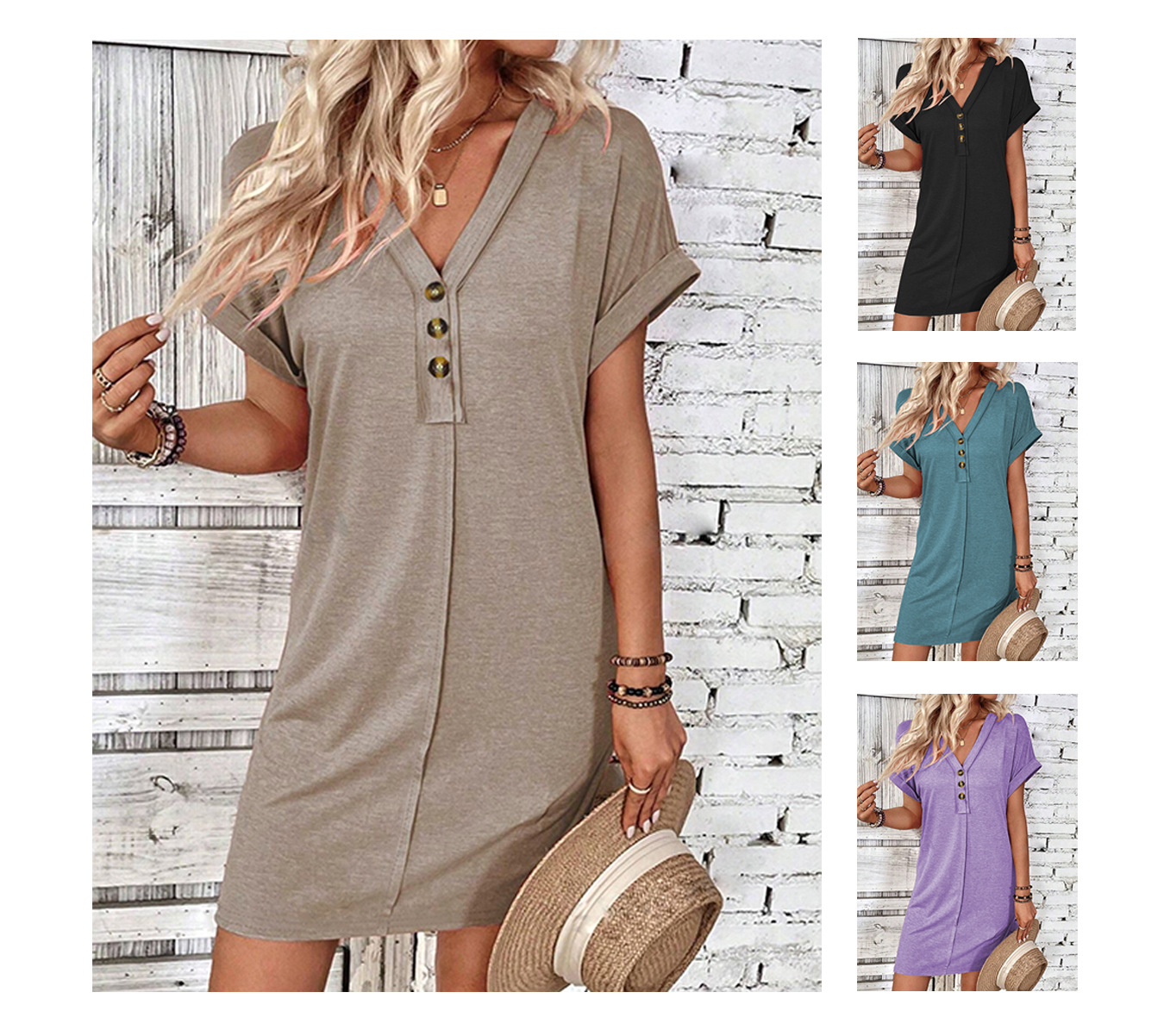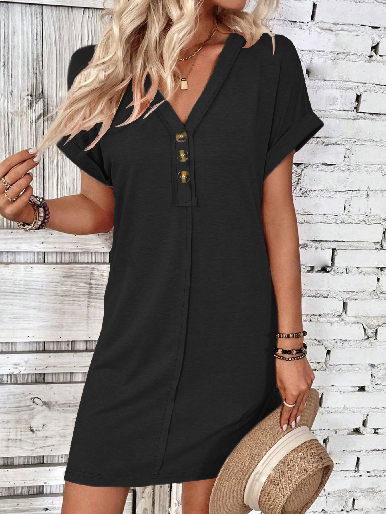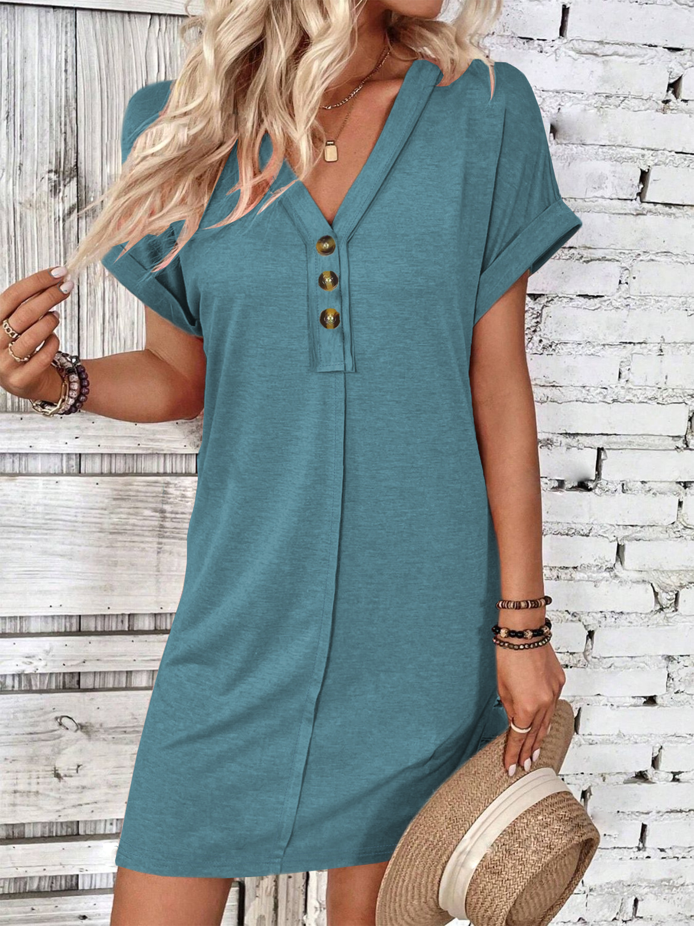 Atraskite tobulą rafinuotumo ir komforto derinį su šiuo moterų V formos kaklo mygtukų midi suknele. Suknelė sukurta universalumui, ji turi elegantišką mygtukų priekį ir trumpas rankoves, todėl puikiai tinka bet kokiai kasdienei progai. Jos midi ilgis suteikia jūsų garderobui laiko patikrintą eleganciją. Nesvarbu, ar einate į vasaros pusryčius, ar į atsitiktinę dieną, ši suknelė yra jūsų pasirinkimas be pastangų stiliui.