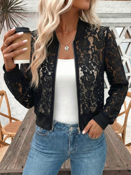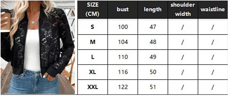 - Dizaino ypatybės: Sujungia permatomą gėlių nėrinį (subtili, moteriška tekstūra) su klasikiniais bomberio akcentais (pilnas užtrauktukas priekyje, gumuotas apdailos kraštas). Tai sujungia kasdienį bomberio stilių su elegantišku nėriniu, sukuriant moterišką ir drąsų įvaizdį.