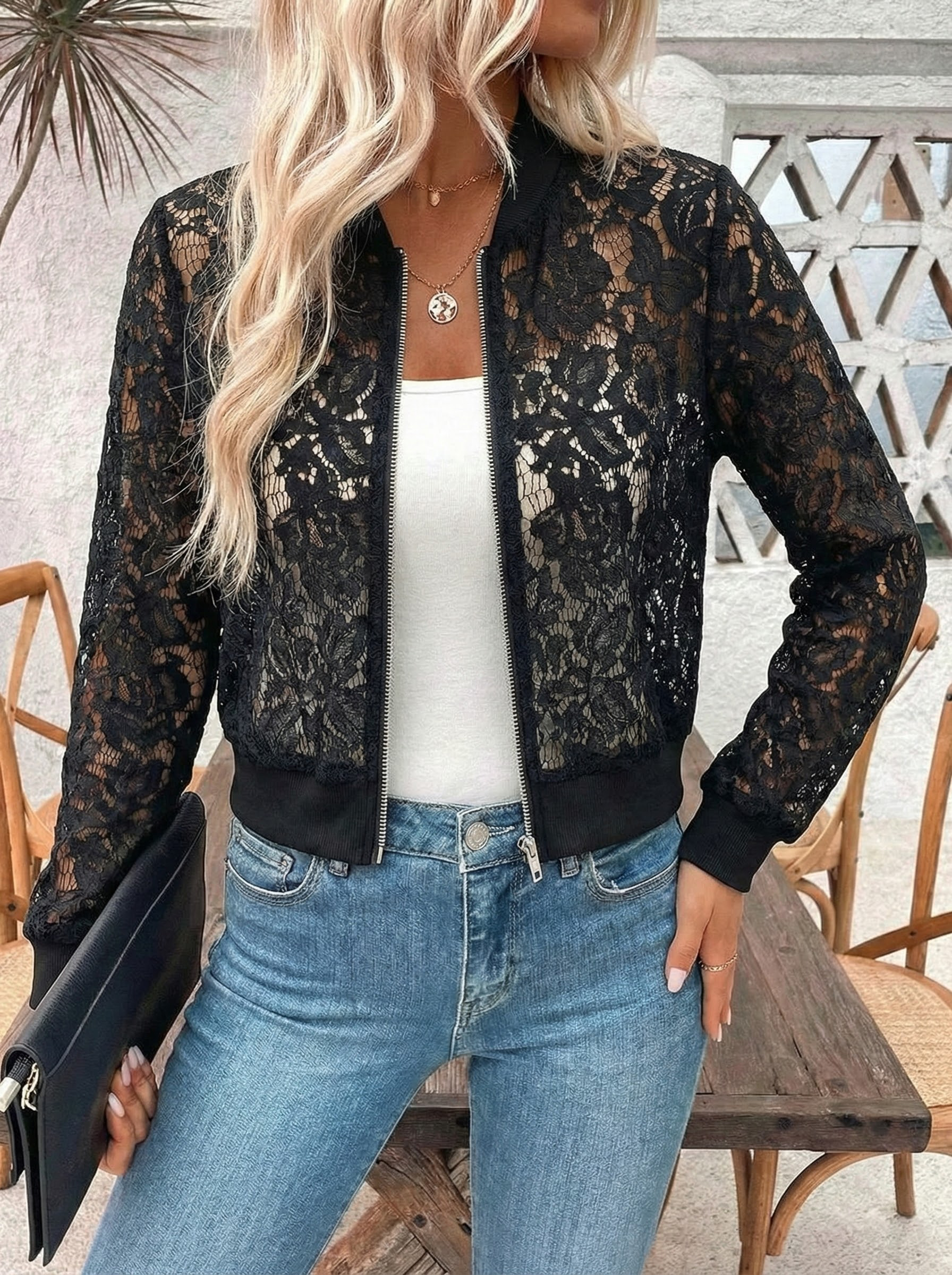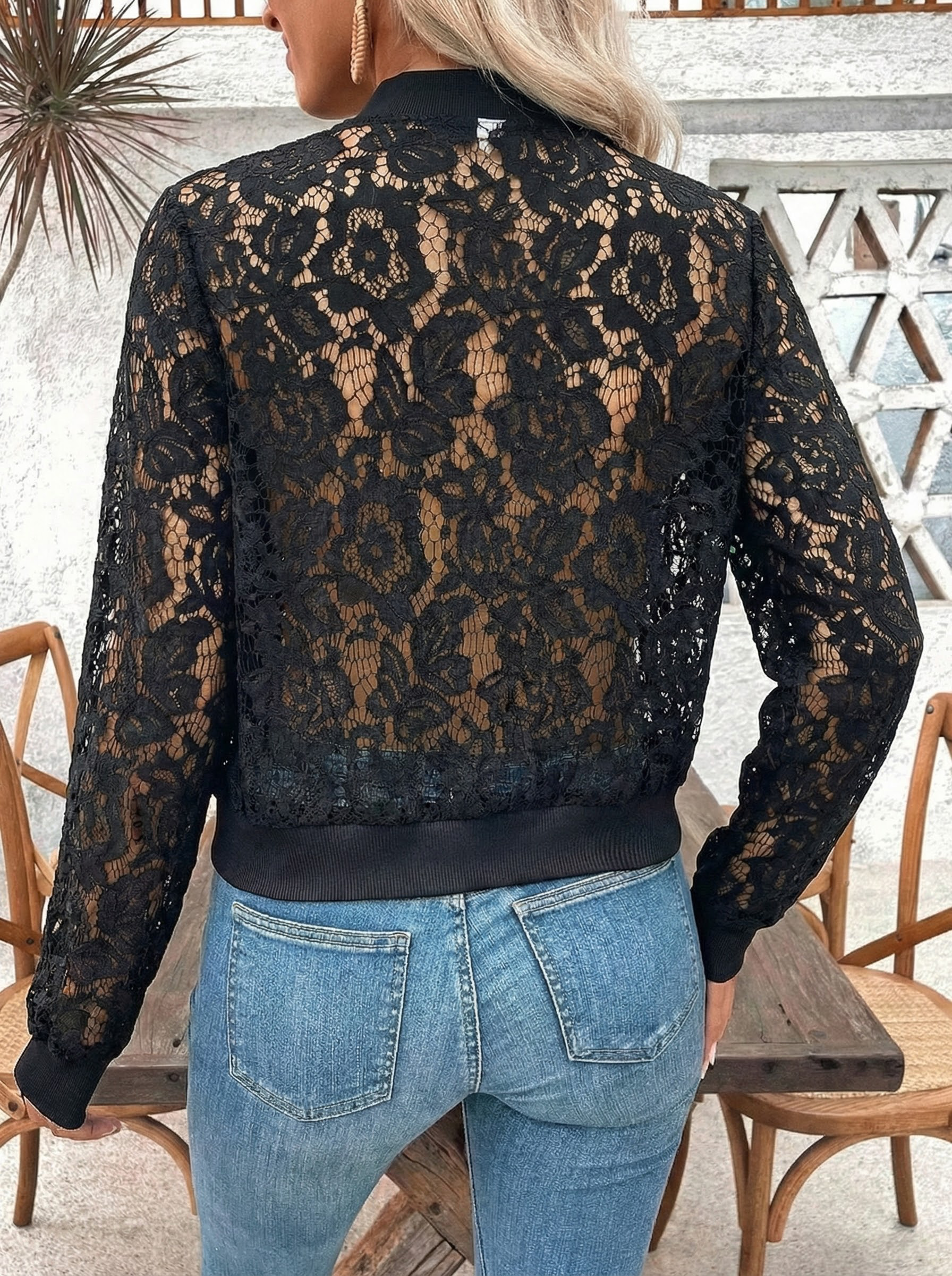 Šis nėrinių bomberio švarkas sujungia subtilų eleganciją su kasdieniu bomberio žavesiu, todėl jis yra išskirtinis sluoksniavimo elementas šiltoms sezonams.