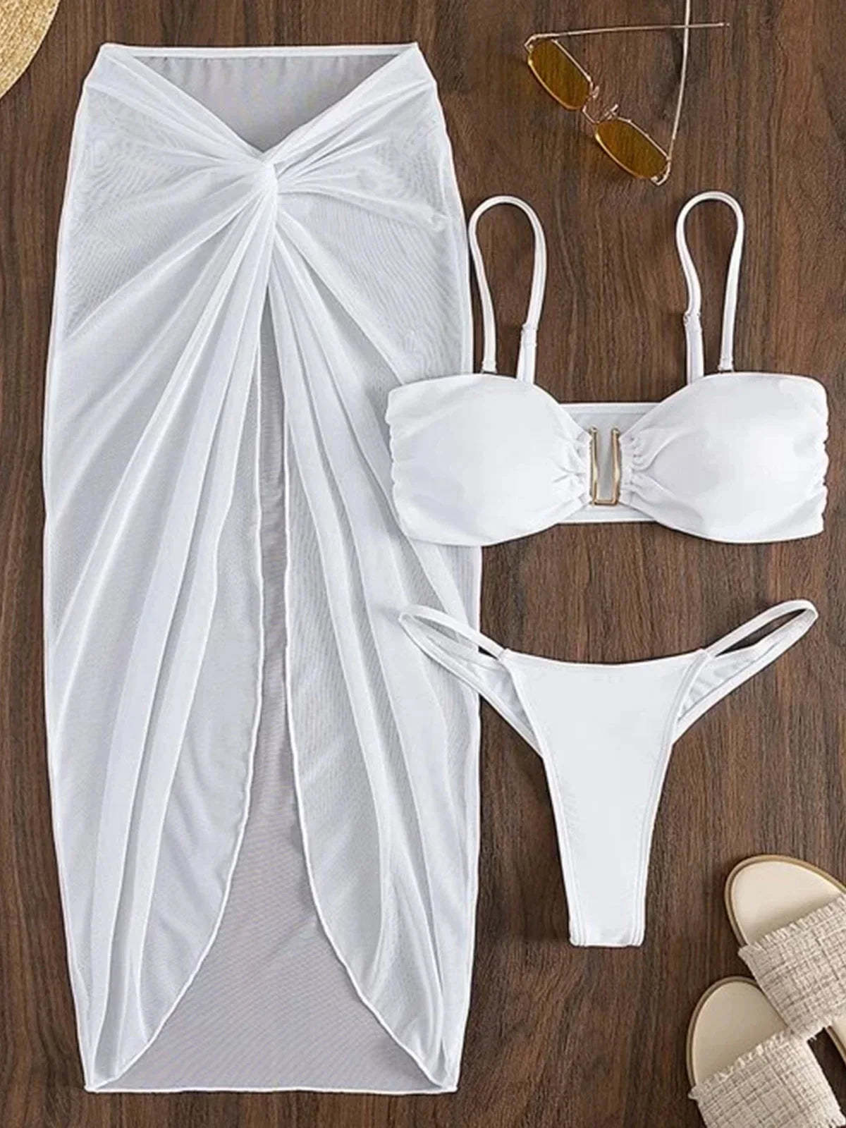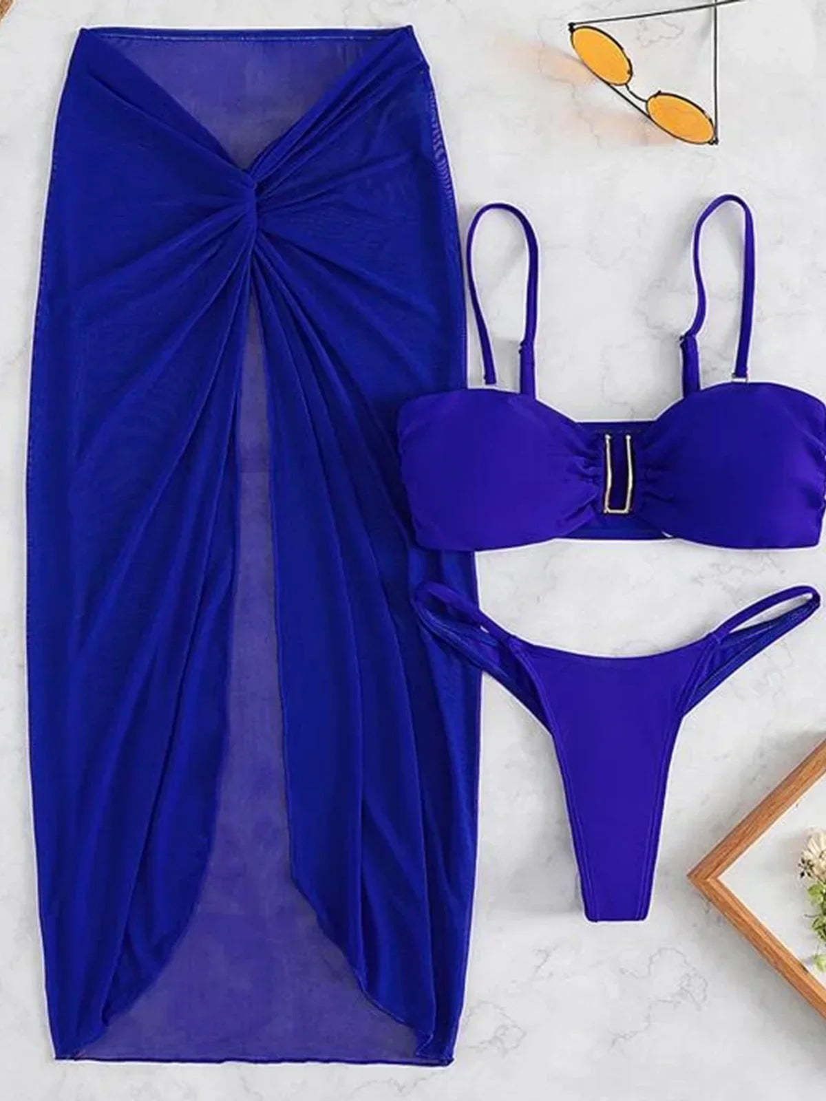 Patobulinkite savo pramogas maudymosi kostiumėliuose su mūsų 3 dalių, raukšlėtu bikini maudymosi kostiumėliu Sarong moterims. Šis universalus rinkinys siūlo neribotas stiliaus galimybes ir patrauklų, stilingą įvaizdį.
