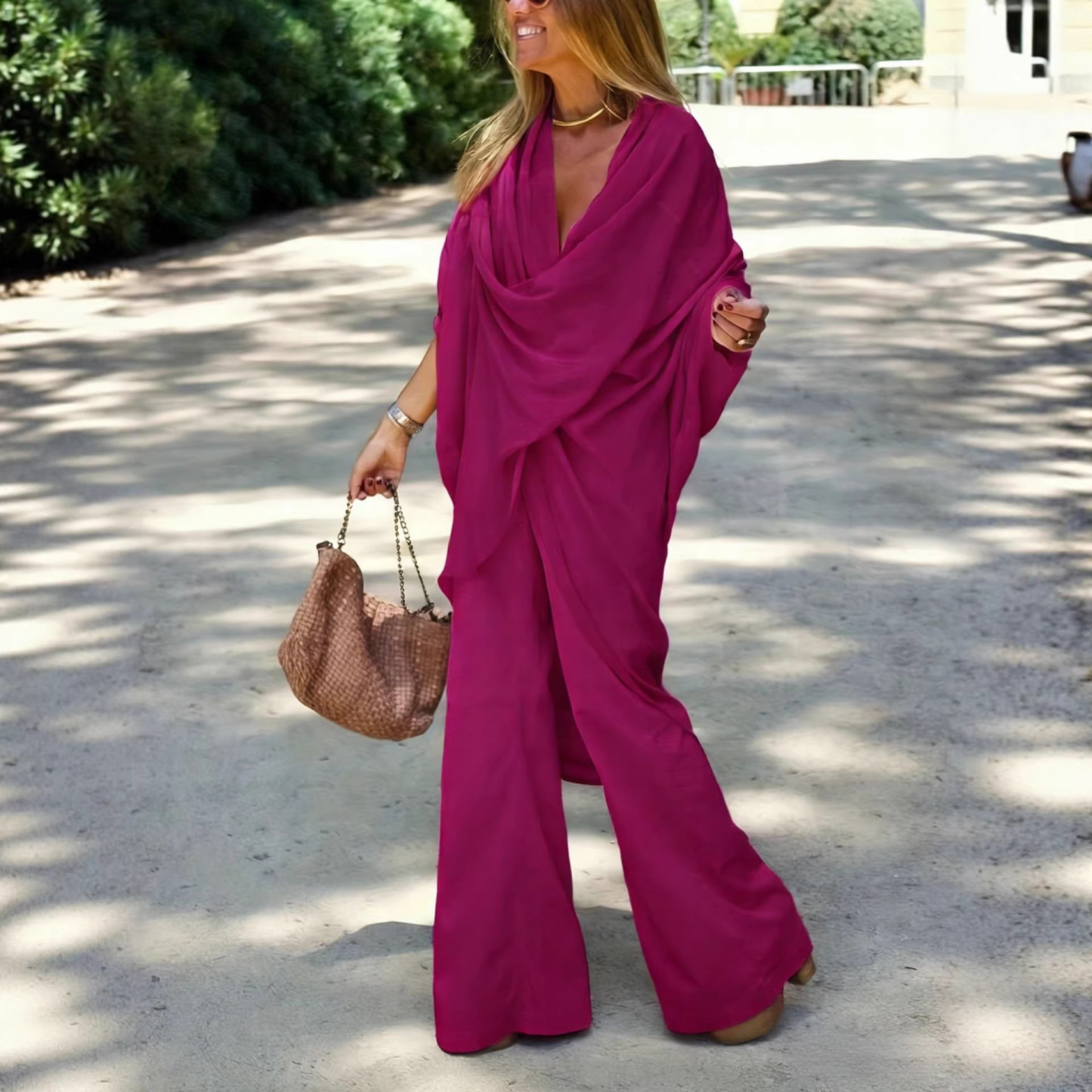 This two-piece bohemian set is made from high-quality polyester fabric for comfort and style. The top is designed with dolman sleeves and a scarf collar, and is worn with high-waisted wide-leg trousers to create a balanced and modern silhouette. Ideal for both casual looks and daytime events.