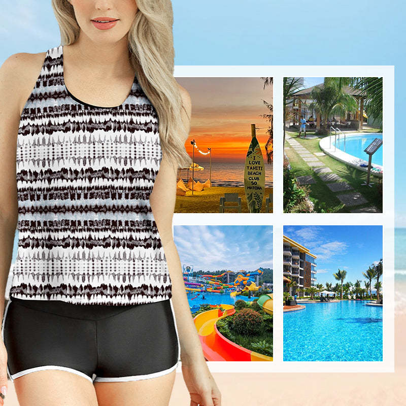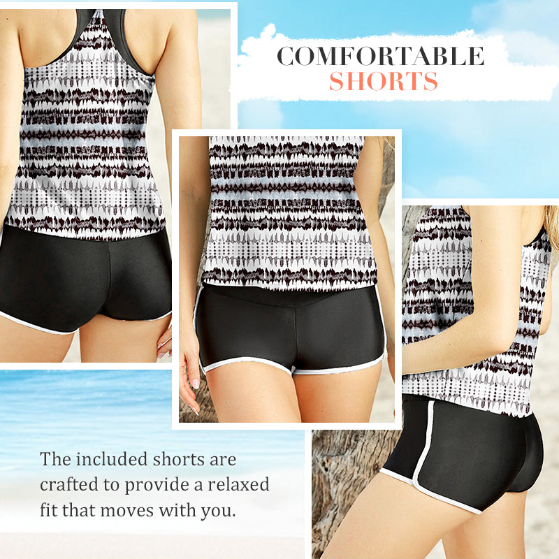 PRINTED TANK TOP – The stylish printed tank top offers modest coverage and a flattering fit. Its vibrant patterns add visual interest, making this set versatile for beachwear or casual outings. The breathable fabric keeps you cool and comfortable under the sun.