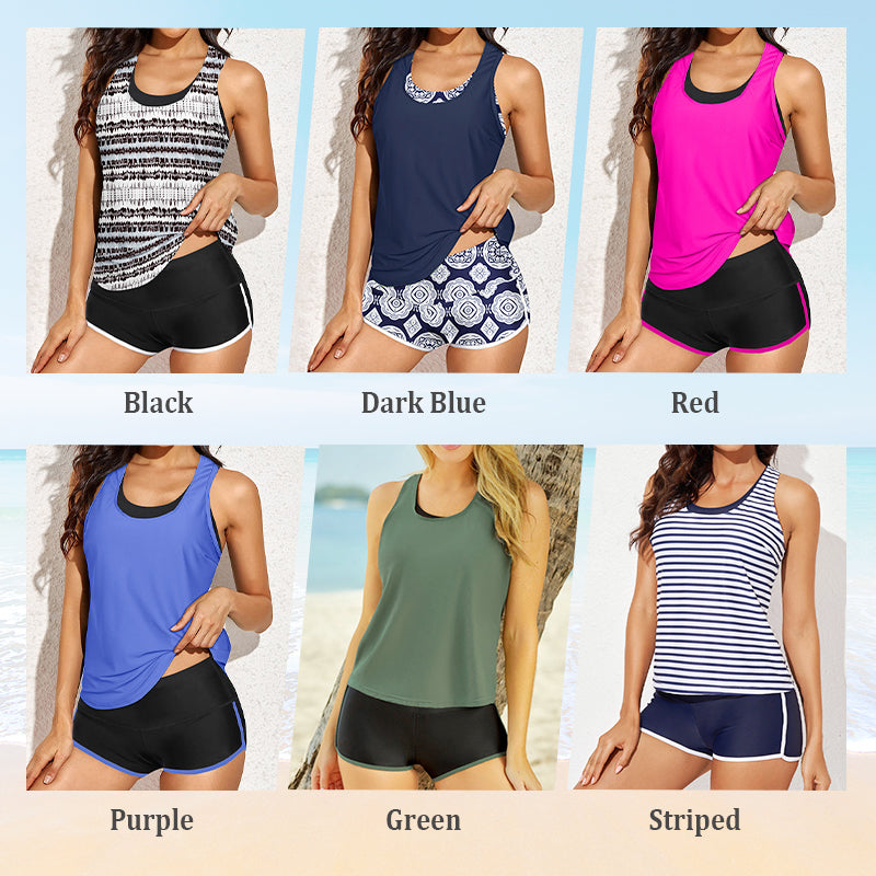 🩱A performance-ready 3-piece tankini set offering sports bra support, breezy coverage, and secure shorts