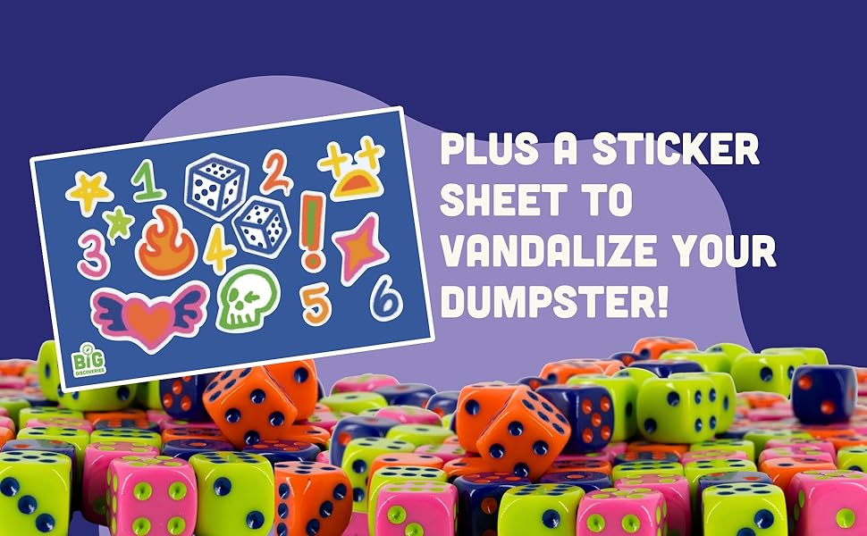 Complete Game Set - Includes a durable dumpster with a removable lid that doubles as the game board, 80 colorful dice in 4 colors, a graffiti sticker sheet, and a clear instruction sheet with 5 unique gameplay variations.