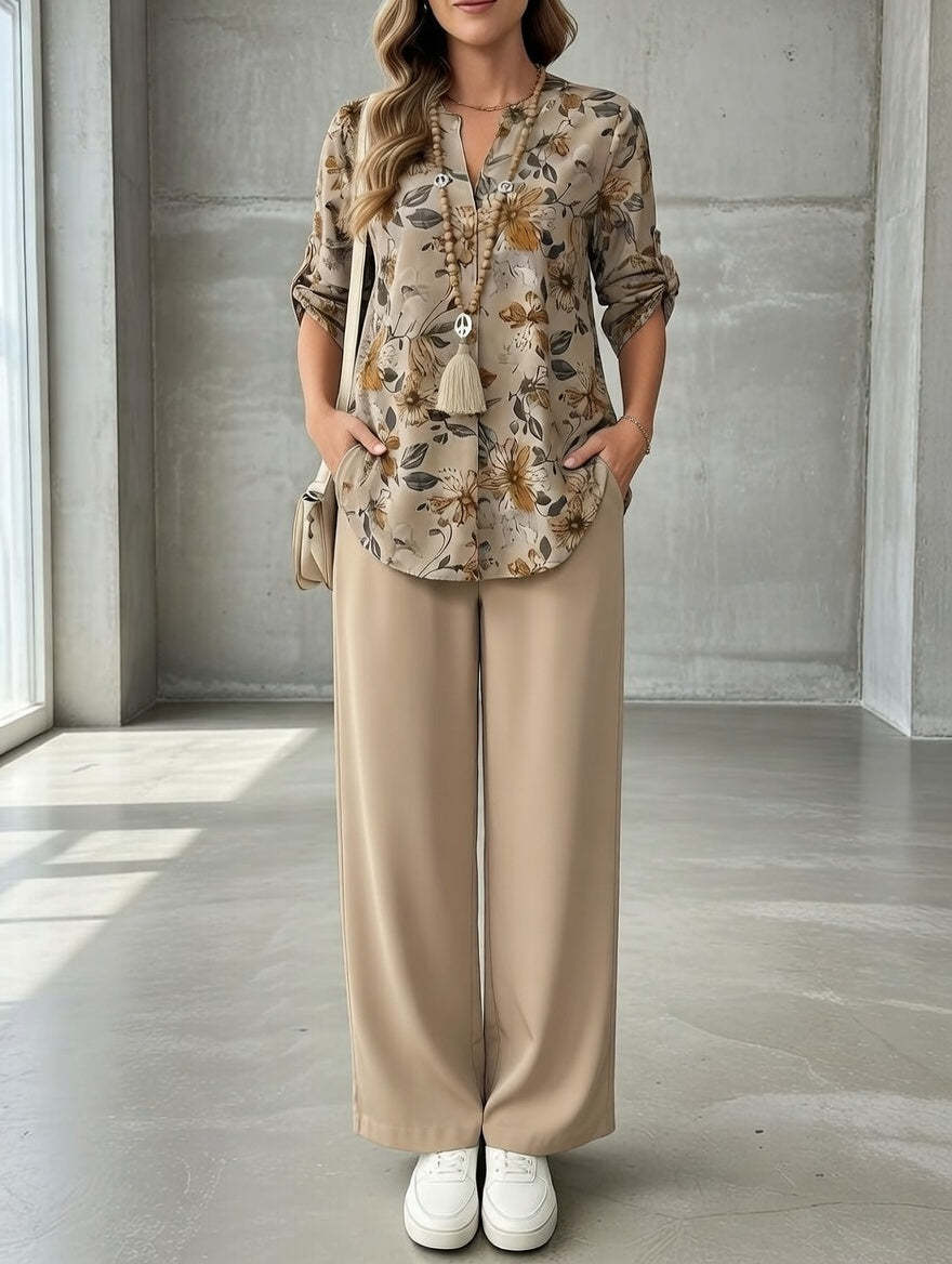 Relaxed sophistication meets blooming warmth in the Elena Signature Set™, a modern two-piece designed for effortless, elevated comfort. Crafted with a softly printed blouse featuring autumnal florals and matching wide-leg trousers, this set blends casual charm with refined ease—perfect for women who want polished style without effort. From coffee runs to relaxed outings, Elena delivers understated luxury you’ll reach for again and again.