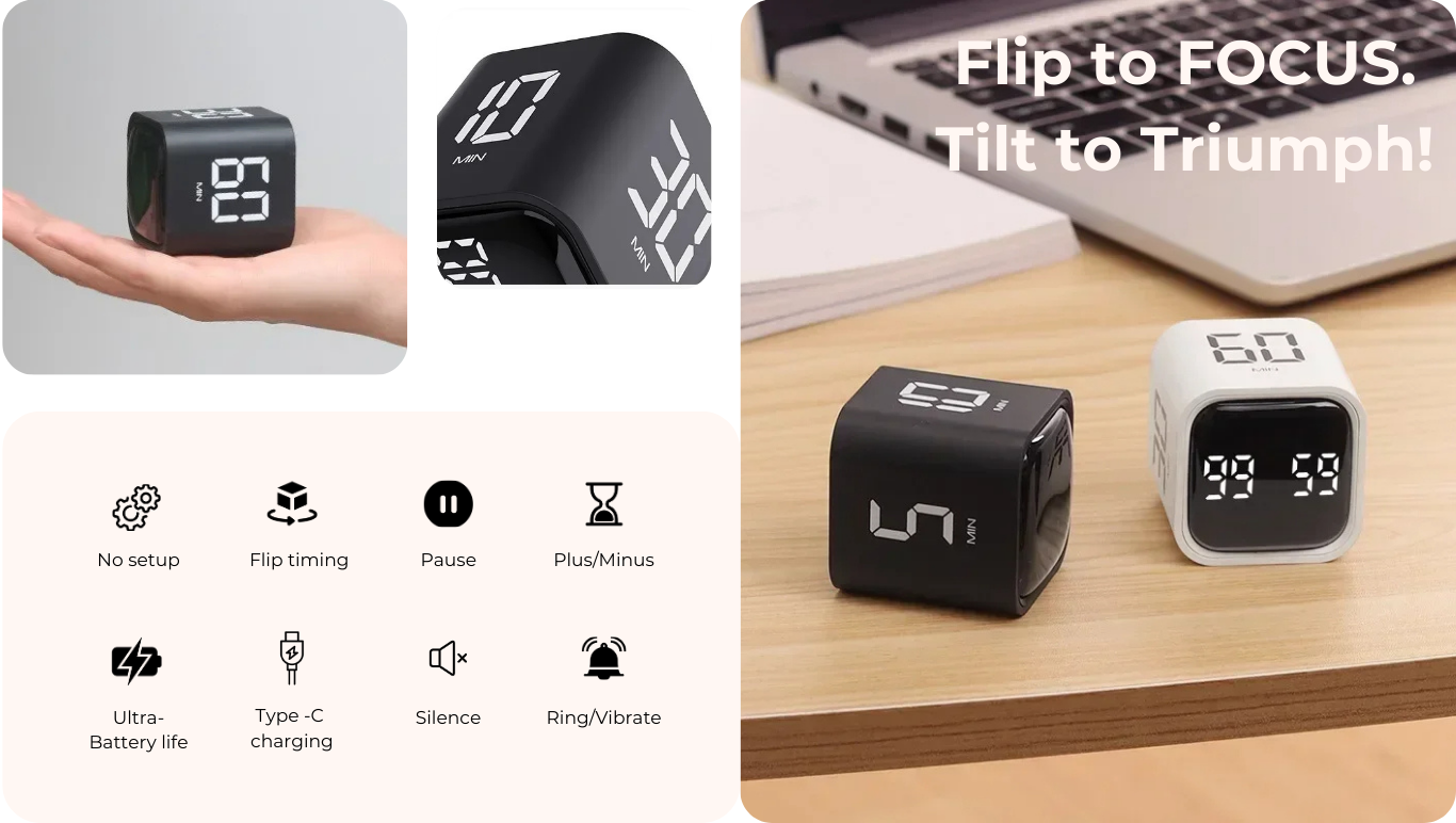 The productivity timer cube encourages a dedicated flow of work, to a dedicated chunk of time. Once the alarm sounds - take a break, reset and commence your next flow of work to your next chunk of time!