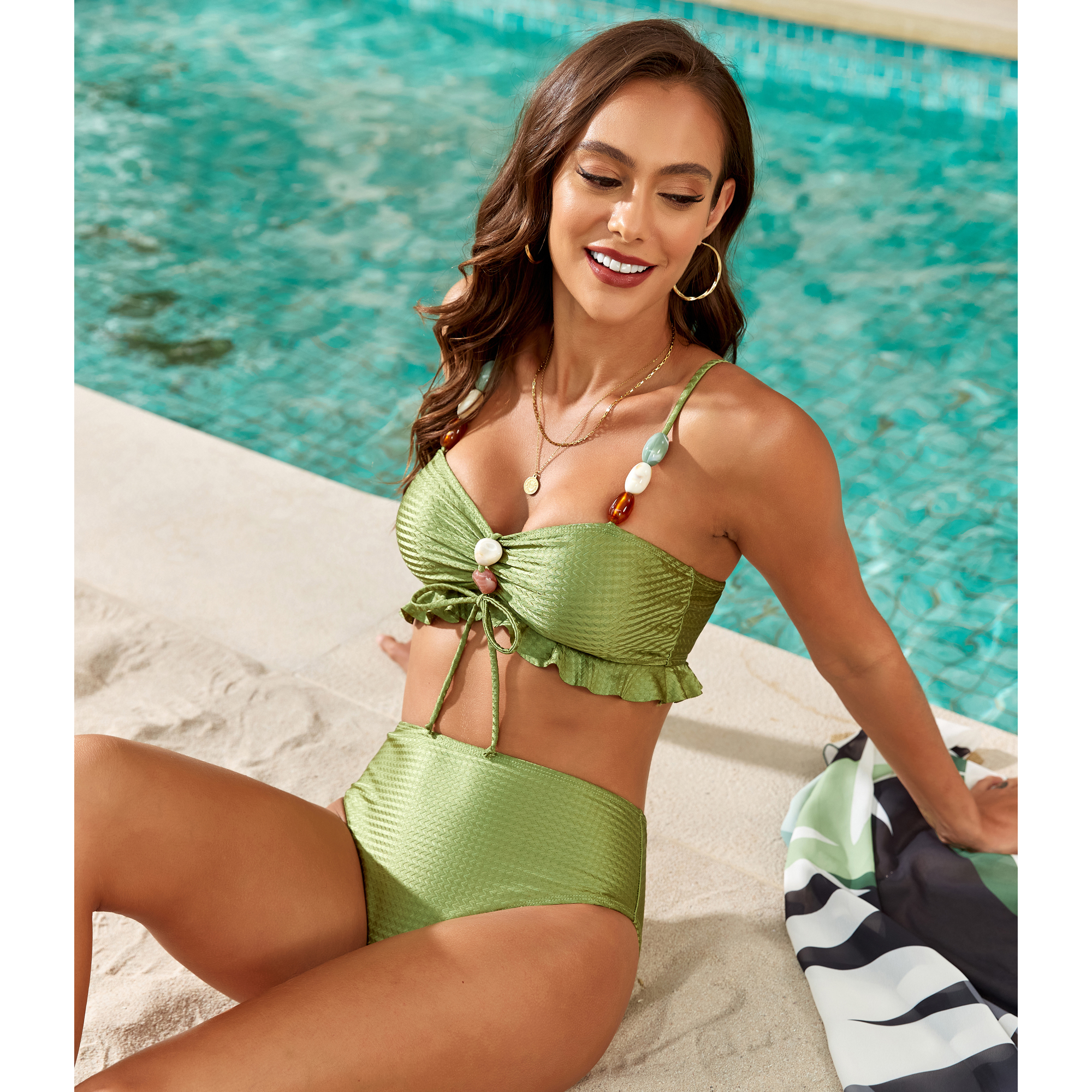 Solid Spaghetti Strap Beaded Two-piece Stretch Bikini Swimsuit
