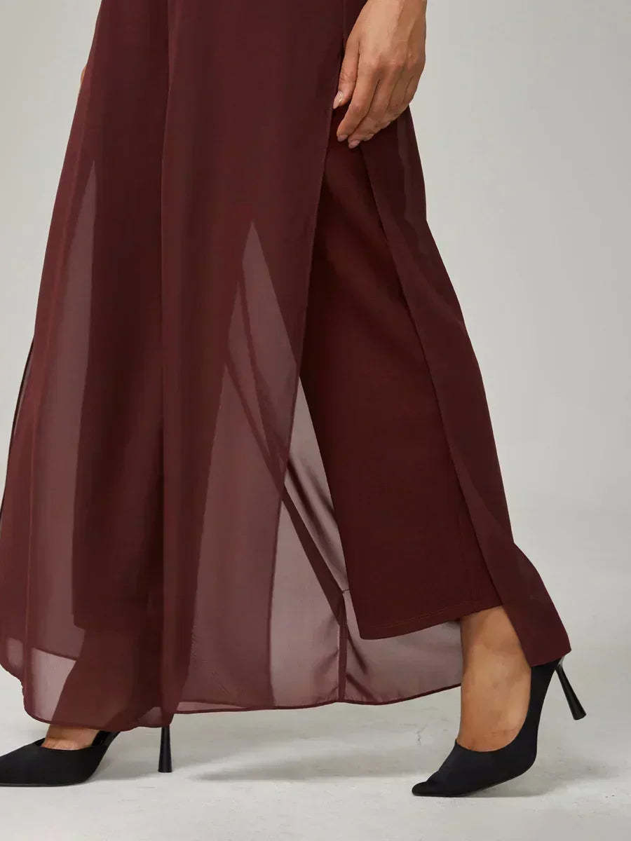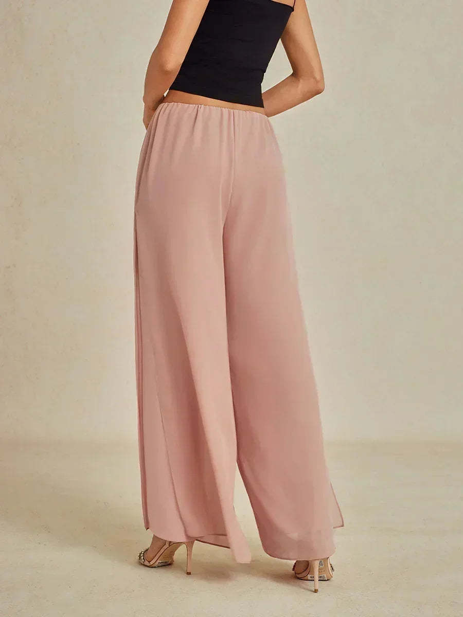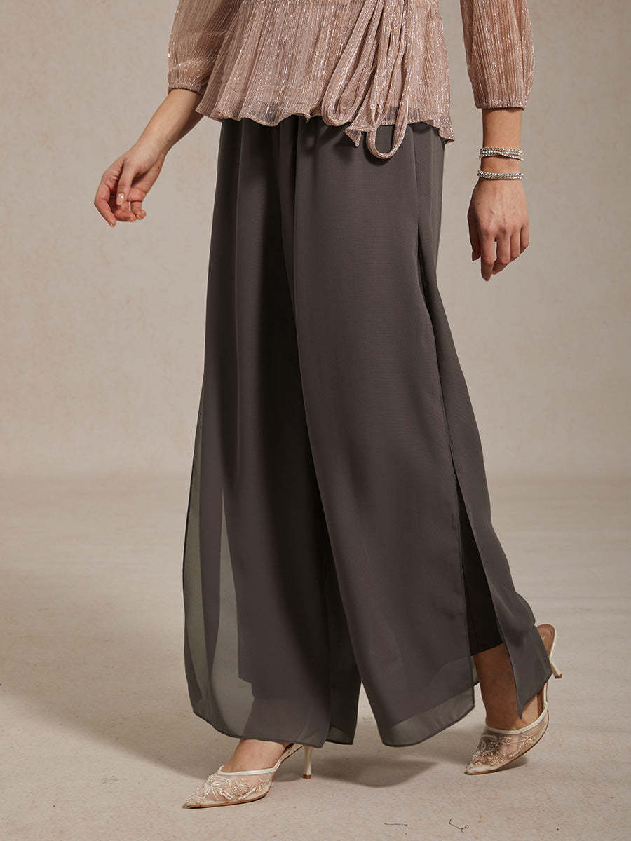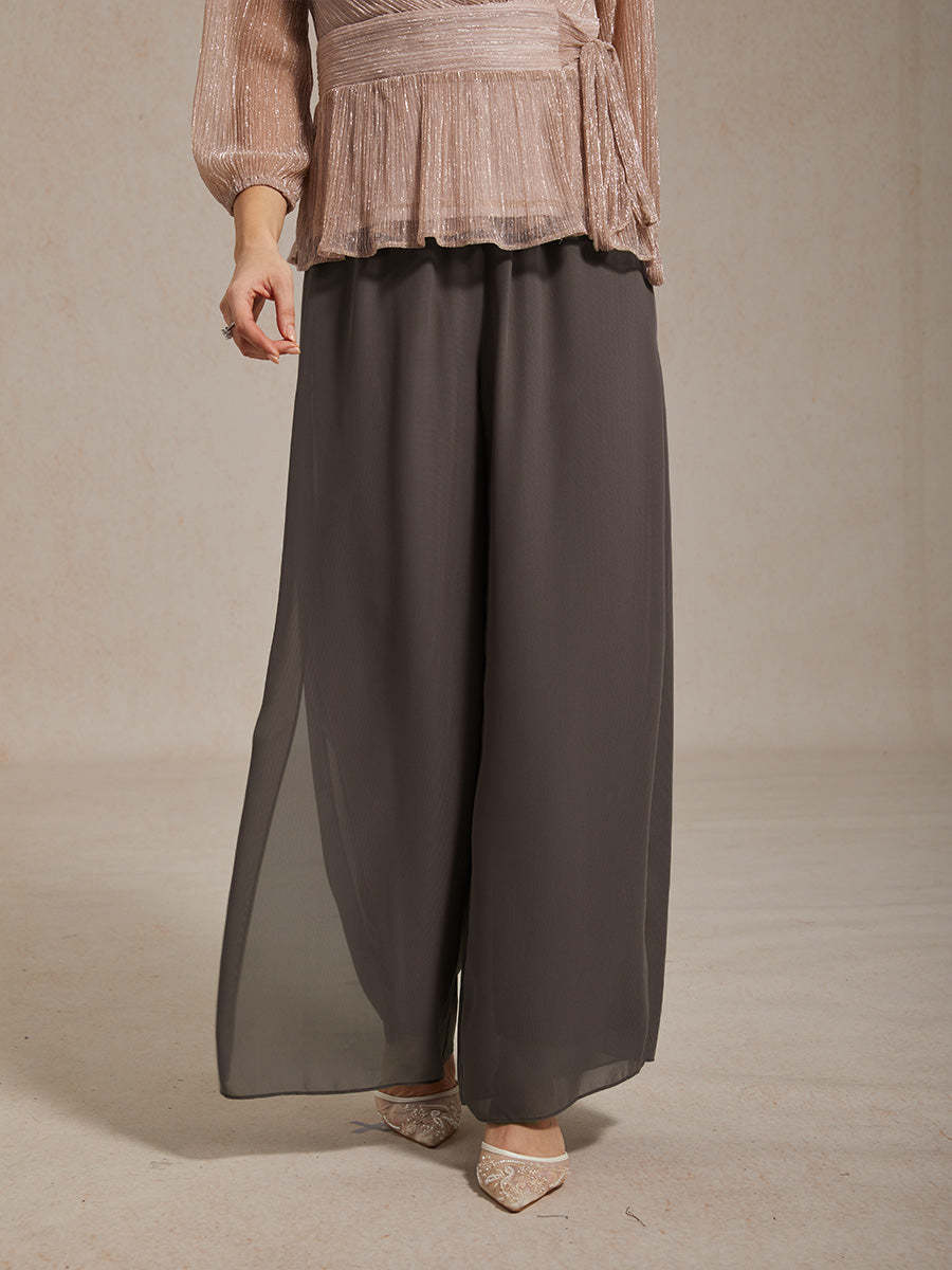 Wkrocz w swobodną elegancję dzięki tym spodniom z prostymi nogawkami i nakładką z lejącego szyfonu i rozciętymi nogawkami. Projekt łączy w sobie wygodę i wyrafinowanie, z miękką, rozciągliwą podszewką do noszenia przez cały dzień. Przezroczysta szyfonowa nakładka dodaje pełnego wdzięku ruchu i odrobiny dramatyzmu, idealna na wieczorne imprezy, wesela, bankiety lub ekskluzywne kolacje. Połącz je ze szpilkami, aby uzyskać wyrafinowany wygląd, lub załóż je do butów na płaskiej podeszwie, aby uzyskać szykowny wygląd w ciągu dnia.