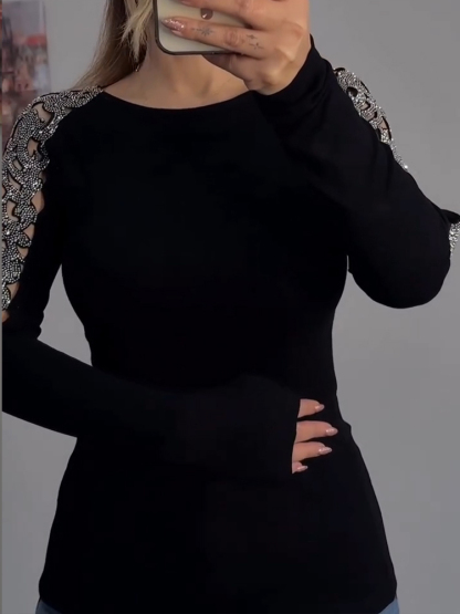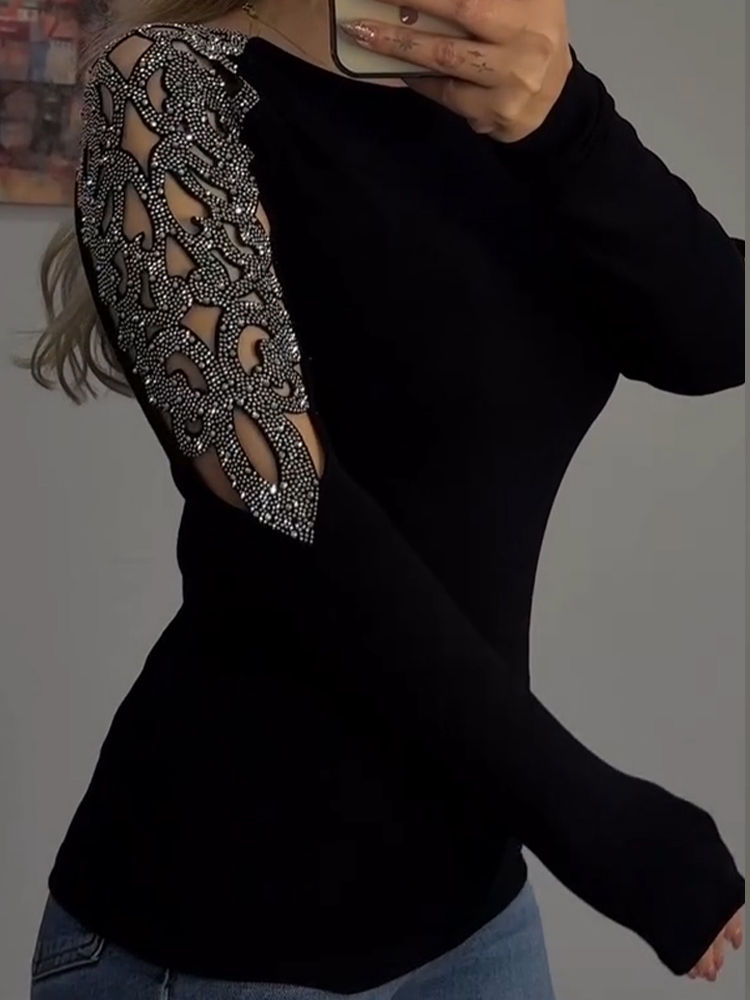 Women Round Neck Sleeves Hollowed Out Hot Stamping Rhinestone Casual Top