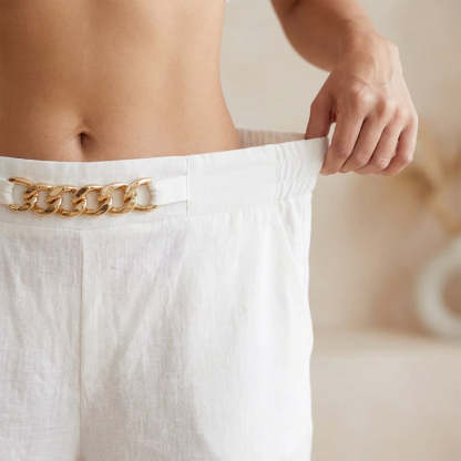OZDOBNY PASEK – Elegancki metaliczny akcent w talii dodaje nutę nowoczesnej elegancji. Ten stylowy akcent podkreśla prosty design, czyniąc te spodnie wyrazistym elementem garderoby, który wymaga niewielu dodatków.