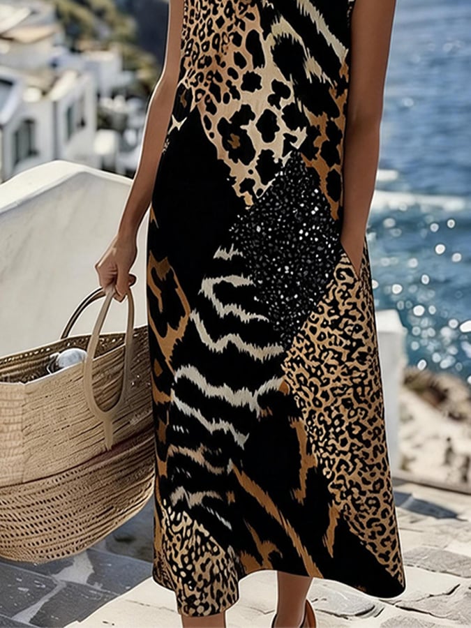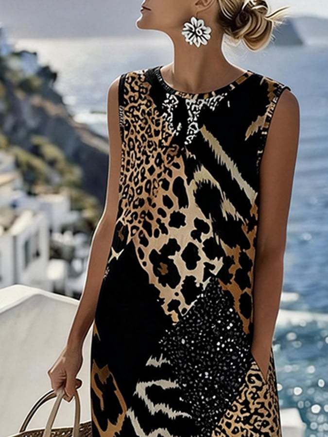 Women'S Round Neck Sleeveless Color-Block Printed Dress